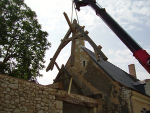 La charpente assemblée est montée à l'aide de notre grue.