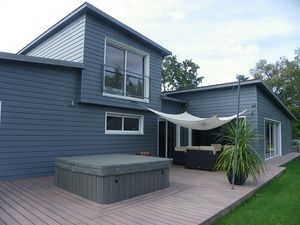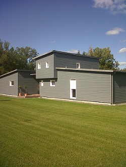 Cette maison est revêtue de Bardage Cédral de chez Eternit, les menuiseries sont de marque PAB et la couverture est en zinc joint debout.
